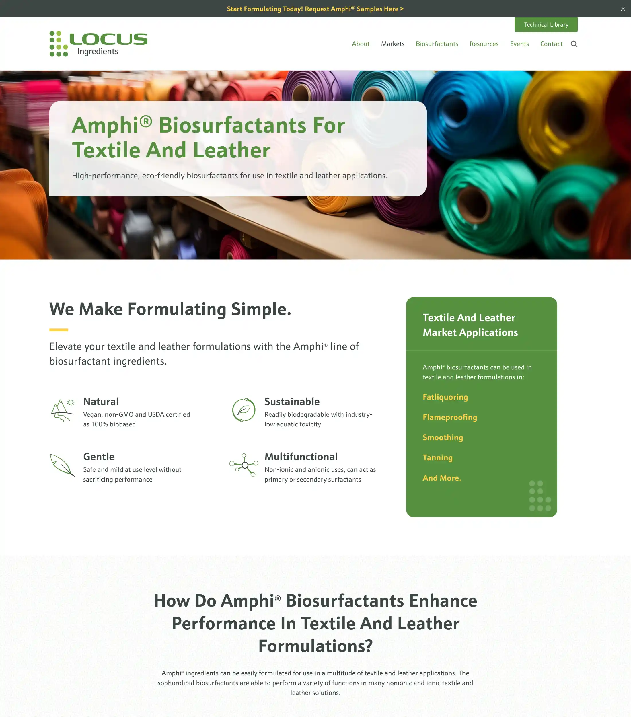 Locus Ingredients is a biotechnology company specializing in fermentation-produced biosurfactants, offering sustainable alternatives to traditional surfactants for various industries. They required a modern, informative, and accessible website to effectively communicate their innovative solutions to potential clients and stakeholders.